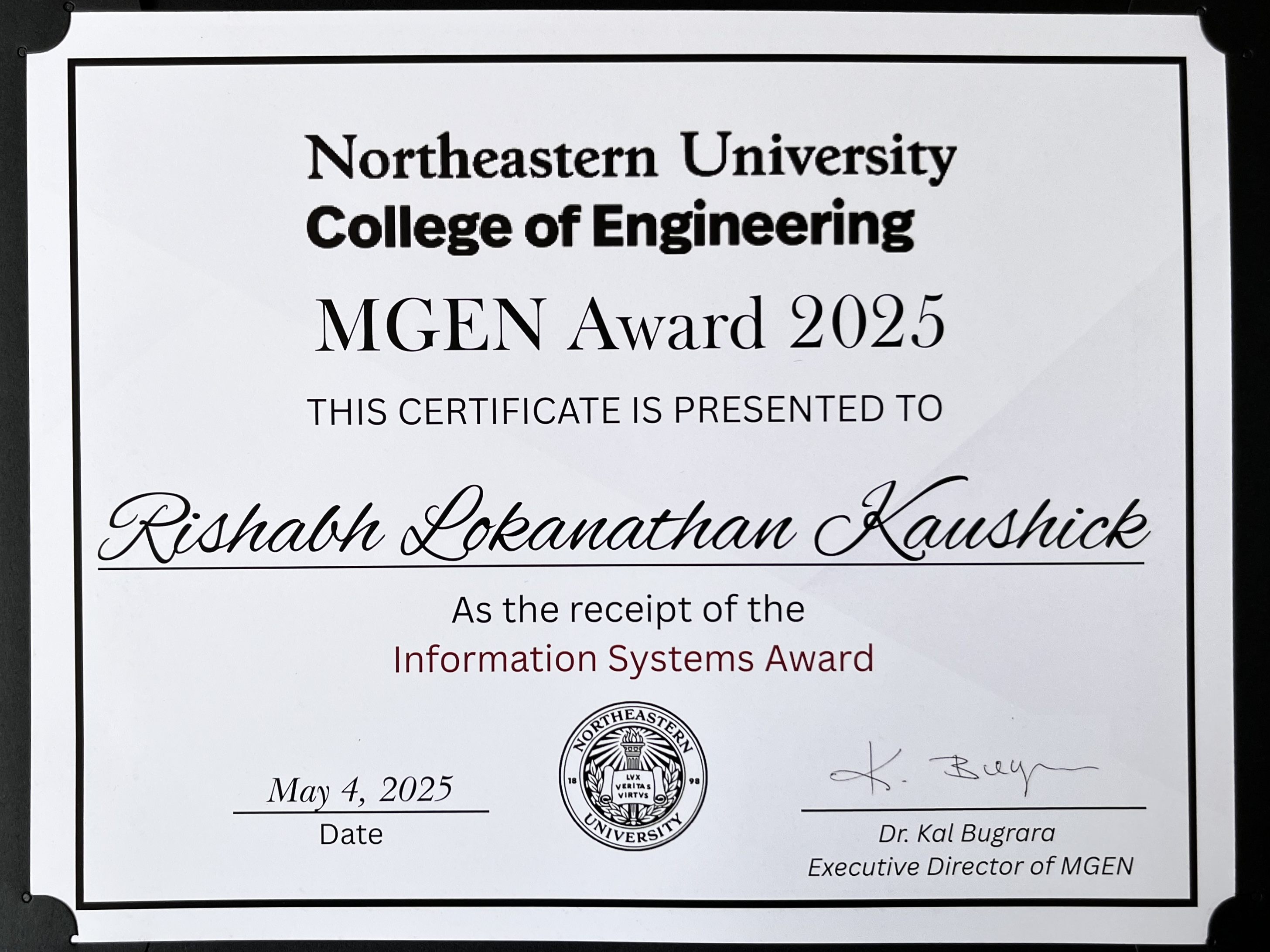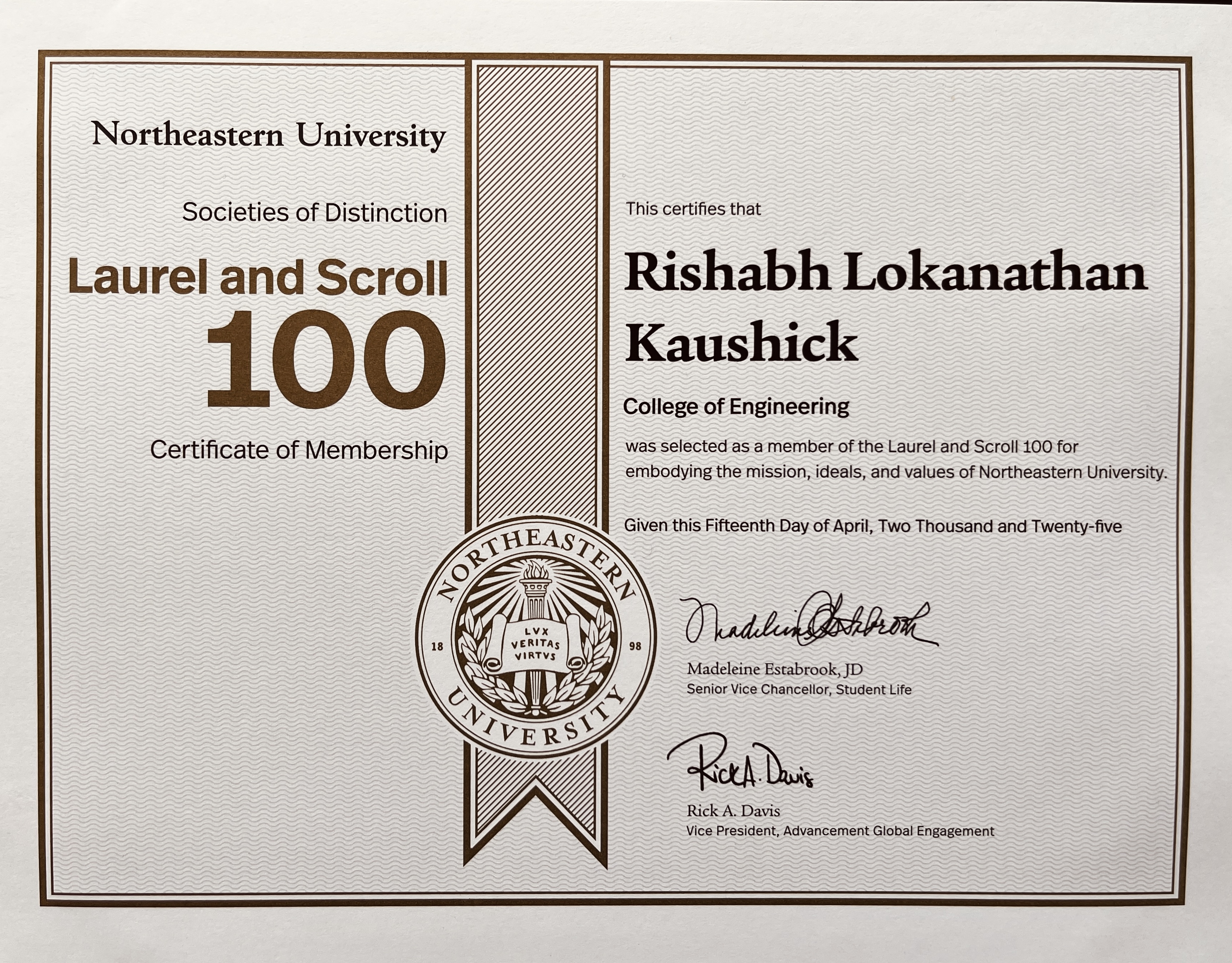 Achieved Laurel and Scroll 100 Society of Distinction for academic excellence, leadership and exemplifying Northeastern University's core values.