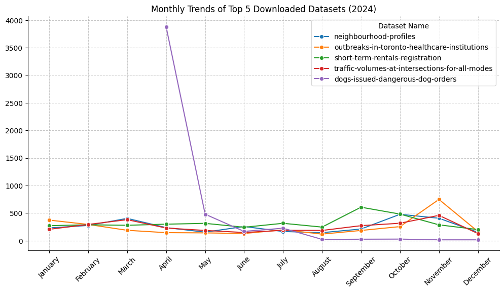 City of Toronto’s Open Data portal saw a consistent increase in dataset session activity compared to 2023, with the most significant spike in April. This spike in April corresponds perfectly with the dogs-issued-dangerous-dog-orders dataset as shown below. Overall, monthly sessions in 2024 outperformed those in 2023 across nearly all months, indicating improved engagement with the portal.