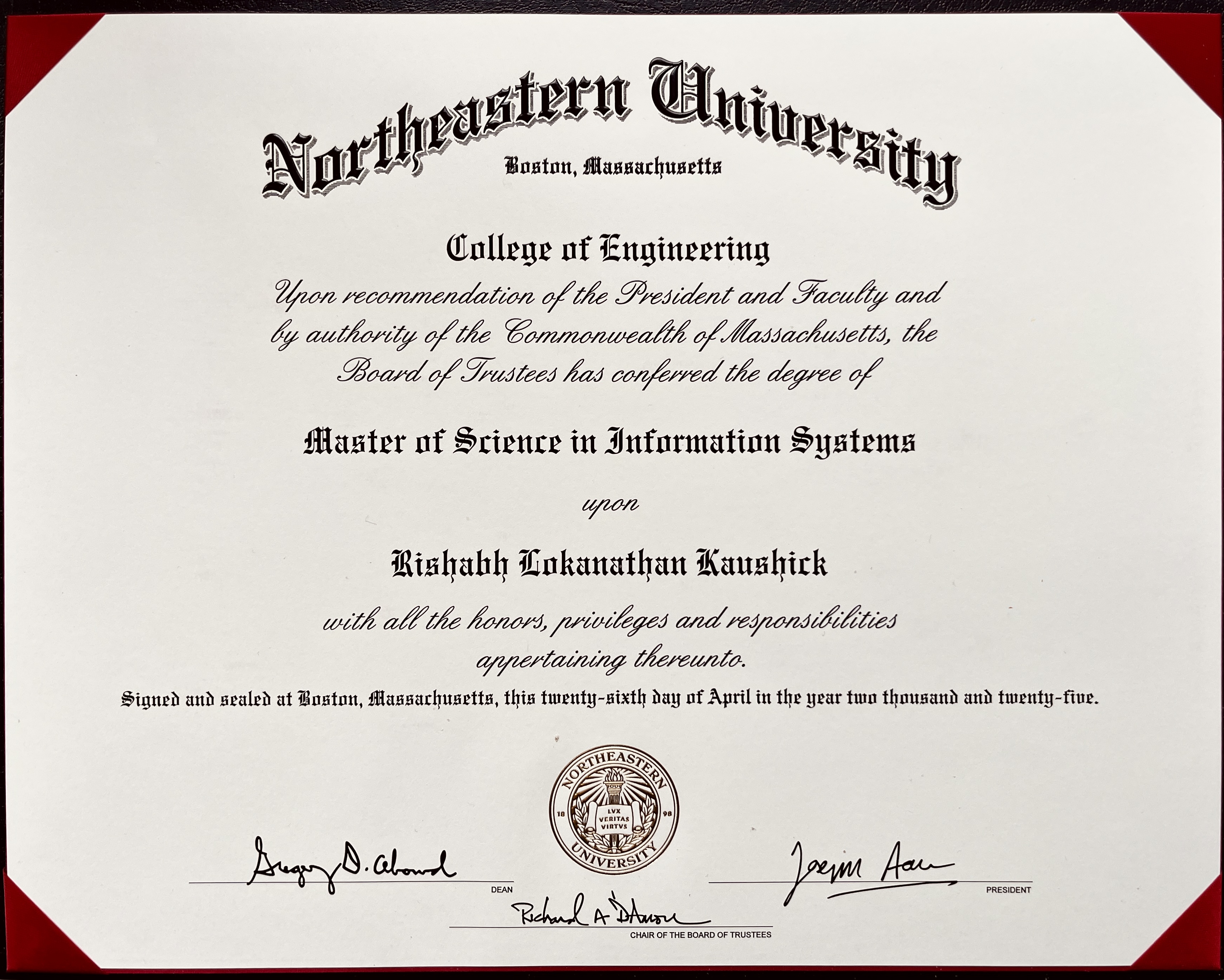 Graduated with a Master of Science in Information Systems from Northeastern University with a 3.8 GPA from the Toronto, ON campus.