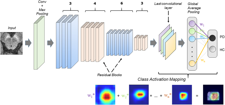 Neuromelanin sensitive magnetic resonance imaging (NMS-MRI) has been crucial in identifying abnormalities in the substantia nigra pars compacta (SNc) in Parkinson's Disease. The extraction of these features is time-consuming and laborious and moreover provides lower prediction accuracies. This work establishes a technique that uses convolutional neural networks (CNNs) to create prognostic and diagnostic biomarkers of PD from NMS-MRI.